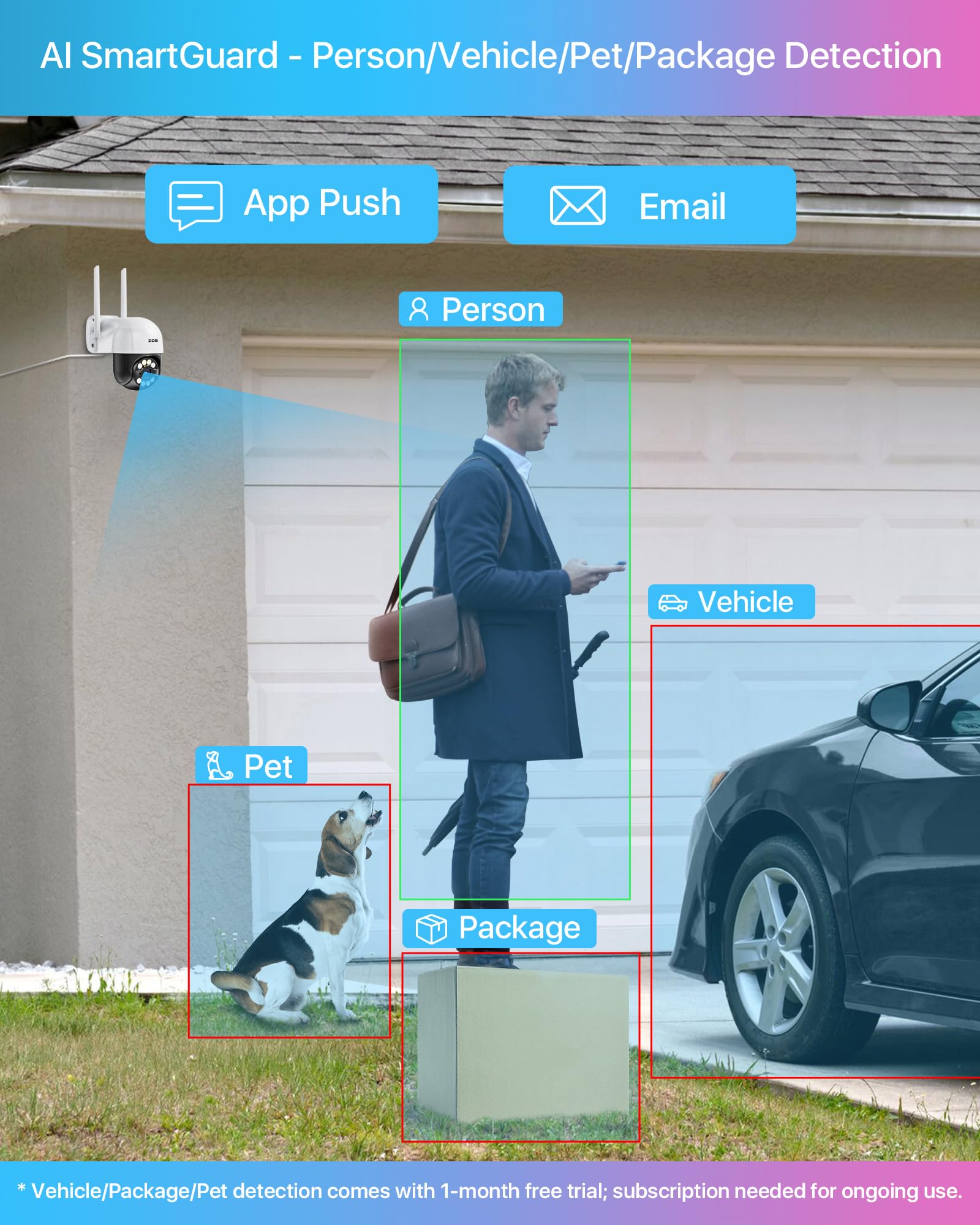 - [AI Detection & Real-time Alerts] ZOSI smart camera provides advanced AI detection, accurately identifying people in real-time. By subscribing to our cloud services, the camera can even detect cars, pets, and packages intelligently. Customize alert areas to avoid unnecessary notifications. The security camera can trigger sound and light alarms upon detecting human motion, while instantly sending app push notifications and email alerts.