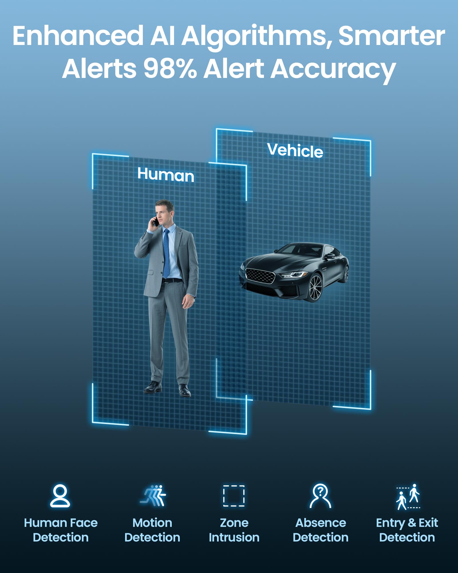 - (2). [ Smart AI Motion Detection & Human Tracking ]__ Equipped with advanced AI, the camera can recognize humans, vehicles, and faces. It also supports automatic human tracking and sends instant app notifications when unusual movement is detected. With built-in sound alarm plus two-way audio, you can not only receive real-time notifications but also actively warn intruders or communicate with family members remotely.
