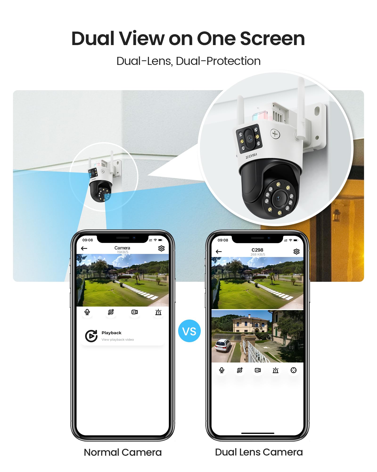 - (5). [ More Stable WiFi Connection ] __ ZOSI dual-lens security camera offers flexibility with both 2.4 GHz WiFi frequencies, ensuring a stable and fast connection. Its IP66 waterproof design allows it to function seamlessly in extreme weather conditions. Perfect for open areas such as parking lots, garages, backyards, and front yards, this outdoor wired security camera is built to withstand various environmental challenges.