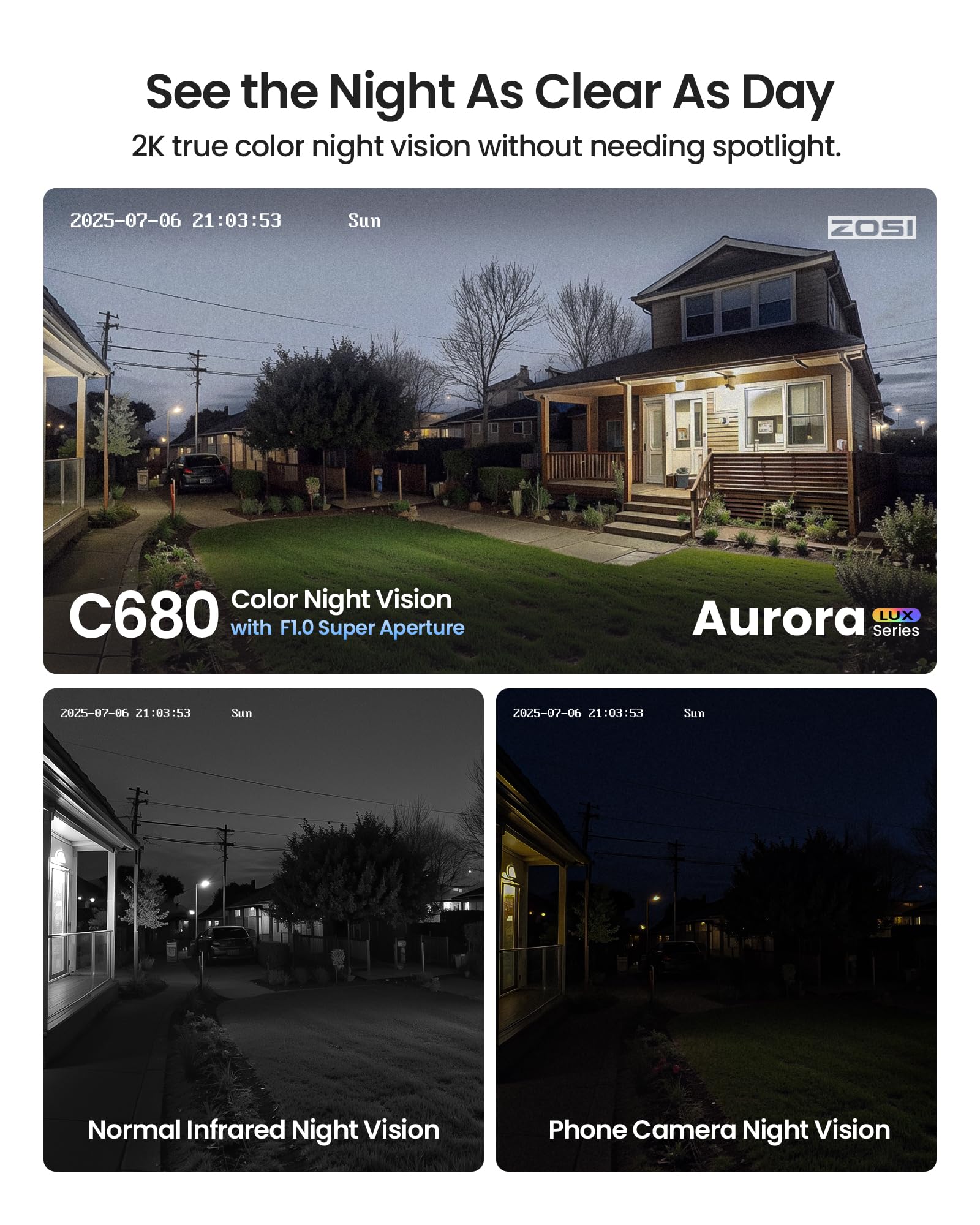 - (2). [ 2K HD with Full-Color Night Vision in Low Light ] __ See every detail, day or night. With an F1.0 large-aperture lens and advanced low-light technology, the camera delivers full-color images even in dim environments—providing better visual evidence than traditional infrared black-and-white. Spot a package at midnight, a pet’s nighttime antics, or a visitor’s face in dim light—way better than traditional infrared’s flat grayscale.